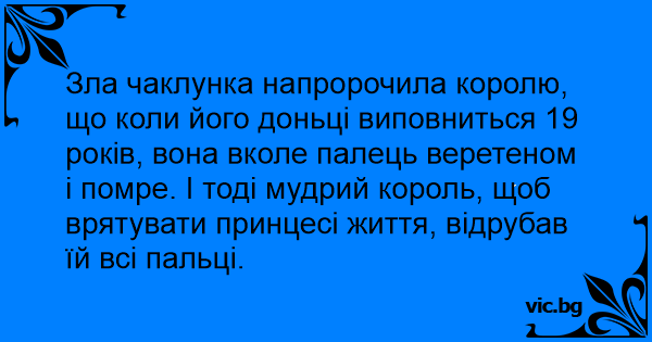 Зла чаклунка напророчила королю, що коли його доньці виповниться 19 років, вона вколе палець веретеном і помре. І тоді мудрий король, щоб врятувати принцесі життя, відрубав їй всі пальці.