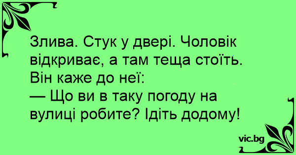 Злива. Стук у двері. Чоловік відкриває, а там теща стоїть. Він каже до неї: