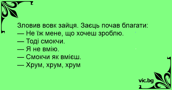 Złapał wilk zająca. - Proszę wilku, nie zabijaj mnie. Zrobię, co zechcesz. - To zrób mi loda. - Nie umiem... - Rób loda. - Kiedy nie umiem... - To rób tak jak umiesz. - Chrup, chrup, chrup...
