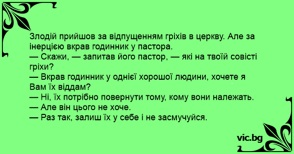 — Скажи, — запитав його пастор, — які на твоїй совісті гріхи?