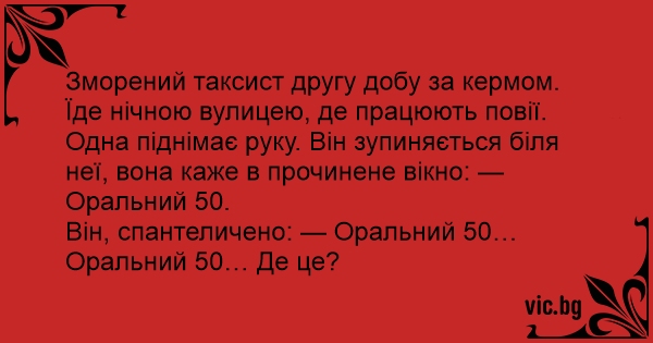 Він, спантеличено: — Оральний 50… Оральний 50… Де це?