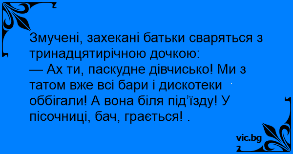 — Ах ти, паскудне дівчисько! Ми з татом вже всі бари і дискотеки оббігали! А вона біля під’їзду! У пісочниці, бач, грається! .