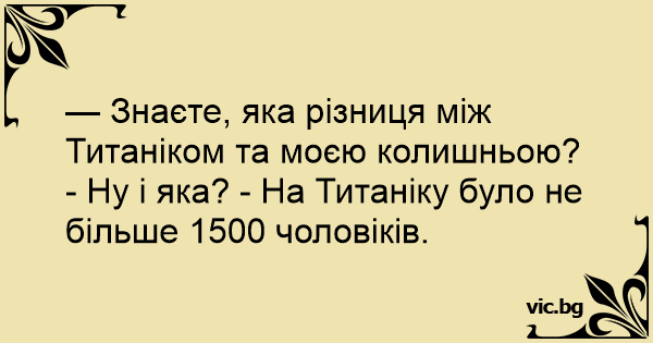 — Знаєте, яка різниця між Титаніком та моєю колишньою? - Ну і яка? - На Титаніку було не більше 1500 чоловіків.