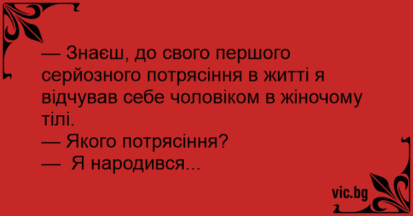 — Знаєш, до свого першого серйозного потрясіння в житті я відчував себе чоловіком в жіночому тілі.