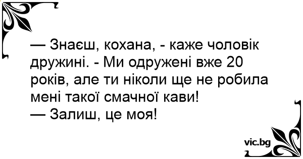 — Знаєш, кохана, - каже чоловік дружині. - Ми одружені вже 20 років, але ти ніколи ще не робила мені такої смачної кави!