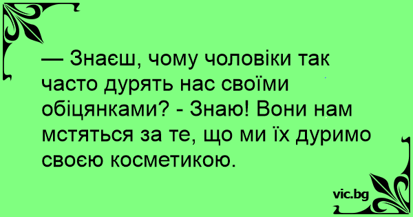 — Знаєш, чому чоловіки так часто дурять нас своїми обіцянками? - Знаю! Вони нам мстяться за те, що ми їх дуримо своєю косметикою.