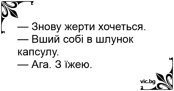 — Знову жерти хочеться.<br />— Вший собі в шлунок капсулу.<br />— Ага. З їжею.