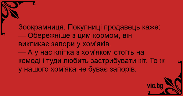 — А у нас клітка з хом'яком стоїть на комоді і туди любить застрибувати кіт. То ж у нашого хом'яка не буває запорів.