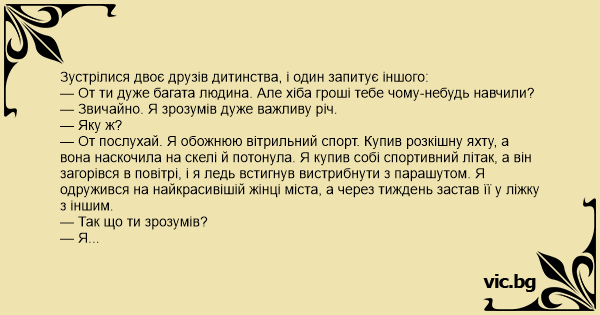 — От послухай. Я обожнюю вітрильний спорт. Купив розкішну яхту, а вона наскочила на скелі й потонула. Я купив собі спортивний літак, а він загорівся в повітрі, і я ледь встигнув вистрибнути з парашутом. Я одружився на найкрасивішій жінці міста, а через тиждень застав її у ліжку з іншим.