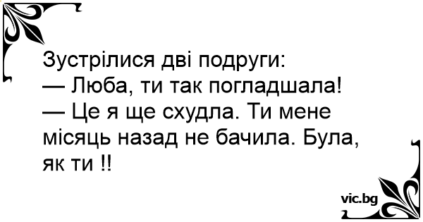 — Це я ще схудла. Ти мене місяць назад не бачила. Була, як ти !!
