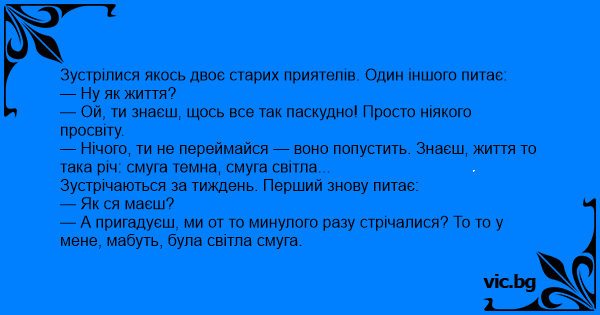— А пригадуєш, ми от то минулого разу стрічалися? То то у мене, мабуть, була світла смуга.