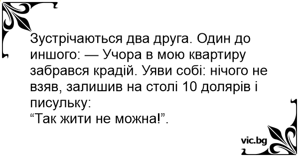 Зустрічаються два друга. Один до иншого: — Учора в мою квартиру забрався крадій. Уяви собі: нічого не взяв, залишив на столі 10 долярів і писульку: