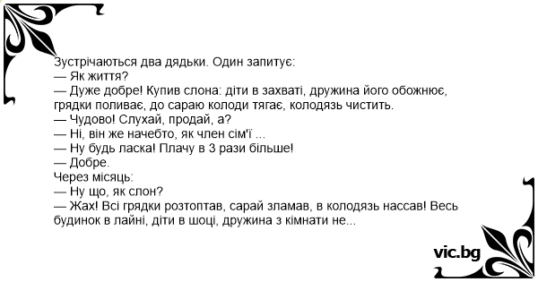 — Дуже добре! Купив слона: діти в захваті, дружина його обожнює, грядки поливає, до сараю колоди тягає, колодязь чистить.