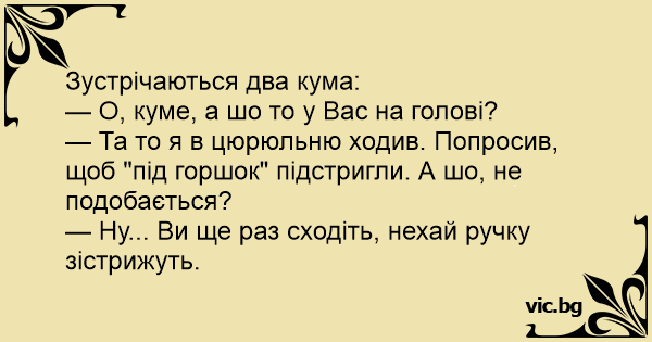— Та то я в цюрюльню ходив. Попросив, щоб "під горшок" підстригли. А шо, не подобається?