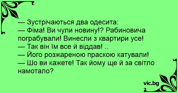 — Фіма! Ви чули новину!? Рабиновича пограбували! Винесли з квартири усе!