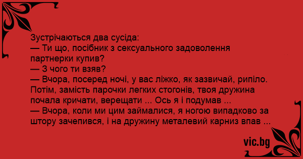 — Вчора, посеред ночі, у вас ліжко, як зазвичай, рипіло. Потім, замість парочки легких стогонів, твоя дружина почала кричати, верещати ... Ось я і подумав ...