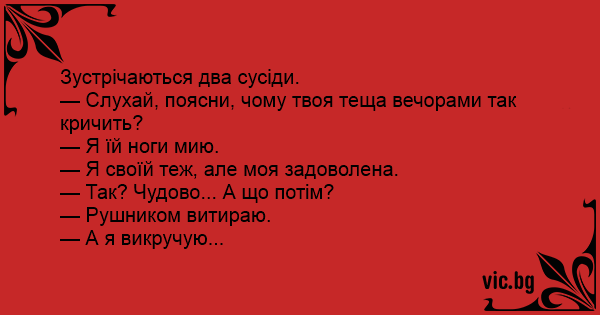 — Слухай, поясни, чому твоя теща вечорами так кричить?