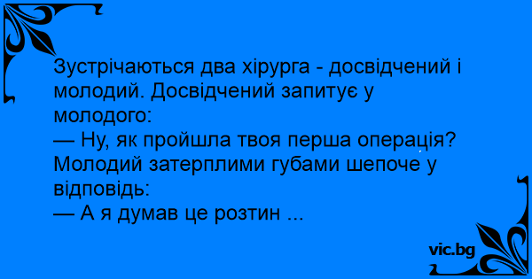 — Ну, як пройшла твоя перша операція? Молодий затерплими губами шепоче у відповідь: