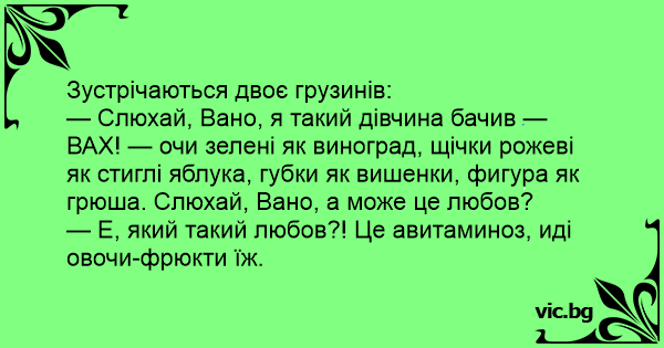 — Слюхай, Вано, я такий дівчина бачив — ВАХ! — очи зелені як виноград, щічки рожеві як стиглі яблука, губки як вишенки, фигура як грюша. Слюхай, Вано, а може це любов?