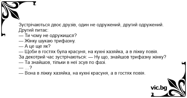 — Щоби в гостях була красуня, на кухні хазяйка, а в ліжку повія.