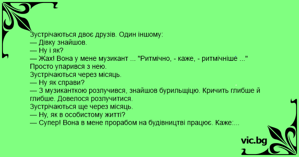 Зустрічаються двоє друзів. Один іншому: — Дівку знайшов. — Ну і як? — Жах! Вона у мене музикант ... "Ритмічно, - каже, - ритмічніше ..." Просто упарився з нею. Зустрічаються через місяць. — Ну як справи? — З музиканткою розлучився, знайшов бурильщіцю. Кричить глибше й глибше. Довелося розлучитися. Зустрічаються ще через місяць. — Ну, як в особистому житті? — Супер! Вона в мене прорабом на будівництві працює. Каже: "Не хвилюйся, не кінчиш сьогодні, кінчиш завтра чи через місяць. А зовсім не кінчиш, бригада будівельників з західної Україною допоможе".