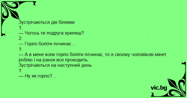 — А в мене коли горло боліти починає, то я своєму чоловікові мінет роблю і на ранок все проходить.