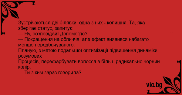 Зустрічаються дві білявки, одна з них - колишня. Та, яка зберігає статус, запитує: