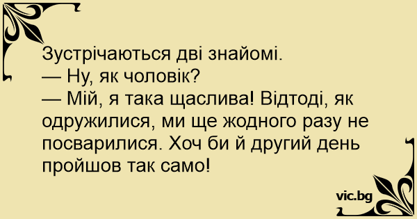 — Мій, я така щаслива! Відтоді, як одружилися, ми ще жодного разу не посварилися. Хоч би й другий день пройшов так само!