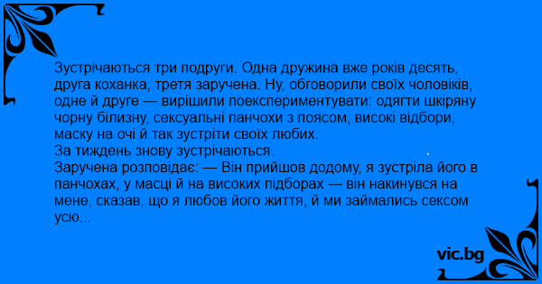 Заручена розповідає: — Він прийшов додому, я зустріла його в панчохах, у масці й на високих підборах — він накинувся на мене, сказав, що я любов його життя, й ми займались сексом усю ніч.
