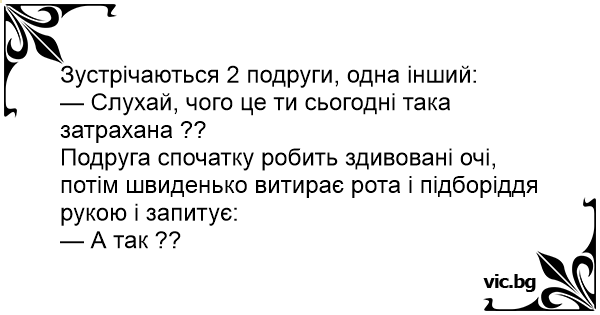 Подруга спочатку робить здивовані очі, потім швиденько витирає рота і підборіддя рукою і запитує: