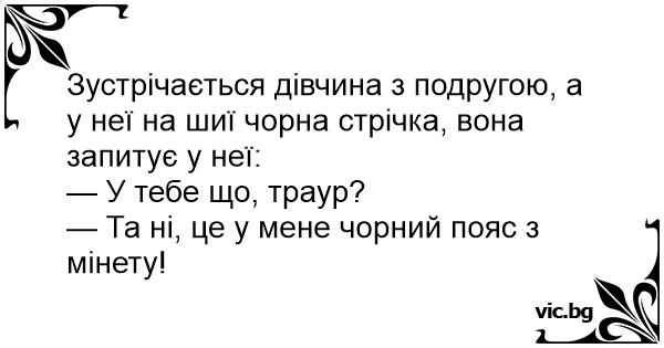 Зустрічається дівчина з подругою, а у неї на шиї чорна стрічка, вона запитує у неї: