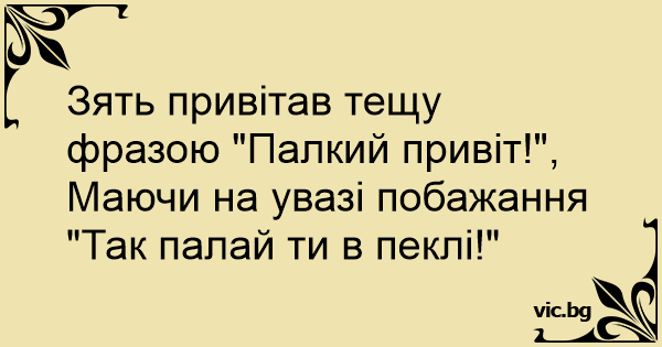 Зять привітав тещу фразою "Палкий привіт!", Маючи на увазі побажання "Так палай ти в пеклі!"
