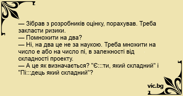 — Ні, на два це не за наукою. Треба множити на число e або на число пі, в залежності від складності проекту.