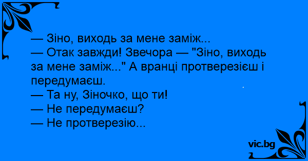 — Отак завжди! Звечора — "Зіно, виходь за мене заміж..." А вранці протверезієш і передумаєш.