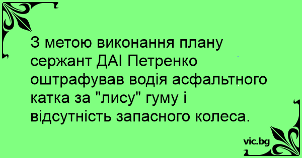 З метою виконання плану сержант ДАІ Петренко оштрафував водія асфальтного катка за "лису" гуму і відсутність запасного колеса.