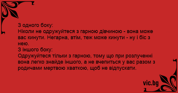 Одружуйтеся тільки з гарною, тому що при розлученні вона легко знайде іншого, а не вчепиться у вас разом з родичами мертвою хваткою, щоб не відпускати.