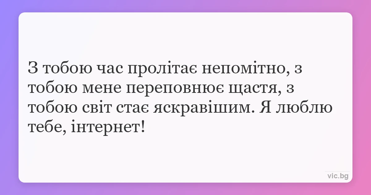 З тобою час пролітає непомітно, з тобою мене переповнює щастя, з тобою світ стає яскравішим. Я люблю тебе, інтернет!