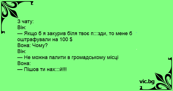 — Якщо б я закурив біля твоє п:::зди, то мене б оштрафували на 100 $