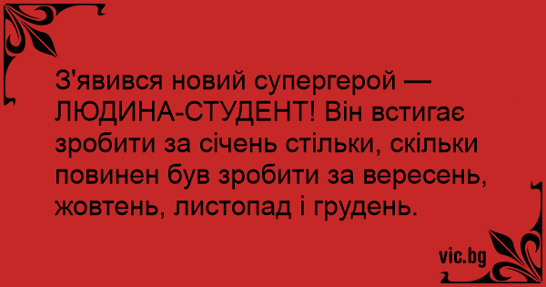 З'явився новий супергерой — ЛЮДИНА-СТУДЕНТ! Він встигає зробити за січень стільки, скільки повинен був зробити за вересень, жовтень, листопад і грудень.