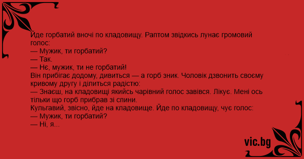 — Знаєш, на кладовищі якийсь чарівний голос завівся. Лікує. Мені ось тільки що горб прибрав зі спини.