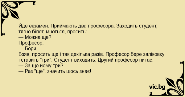 Взяв, просить ще і так декілька разів. Професор бере заліковку і ставить "три". Студент виходить. Другий професор питає: