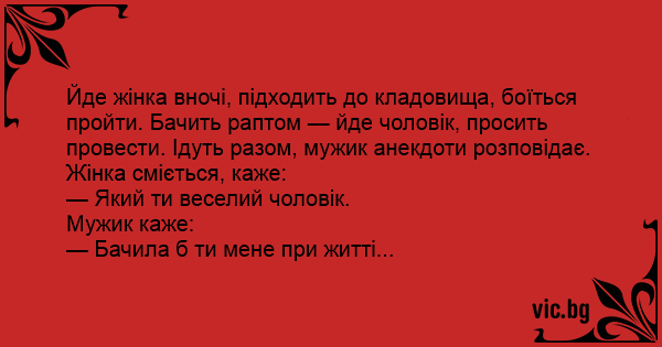Йде жінка вночі, підходить до кладовища, боїться пройти. Бачить раптом — йде чоловік, просить провести. Ідуть разом, мужик анекдоти розповідає.