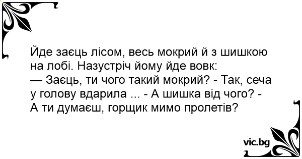 — Заєць, ти чого такий мокрий? - Так, сеча у голову вдарила ... - А шишка від чого? - А ти думаєш, горщик мимо пролетів?
