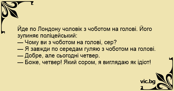 Йде по Лондону чоловік з чоботом на голові. Його зупиняє поліцейський: