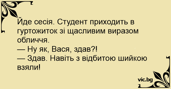 Йде сесія. Студент приходить в гуртожиток зі щасливим виразом обличчя.