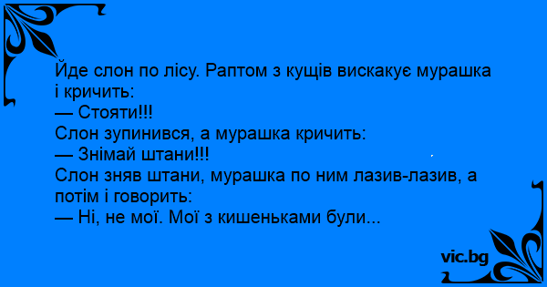 Слон зняв штани, мурашка по ним лазив-лазив, а потім і говорить: