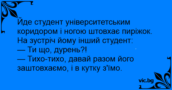 Йде студент університетським коридором і ногою штовхає пиріжок. На зустріч йому інший студент:
