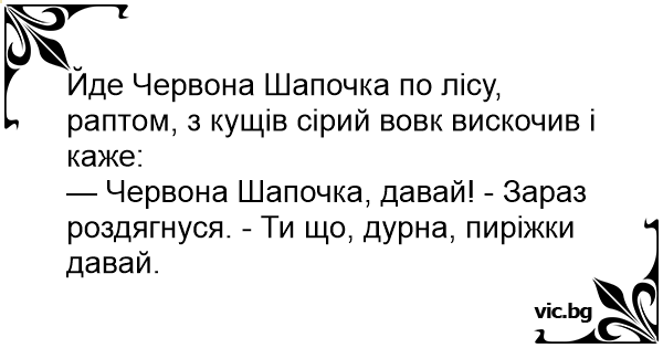 — Червона Шапочка, давай! - Зараз роздягнуся. - Ти що, дурна, пиріжки давай.