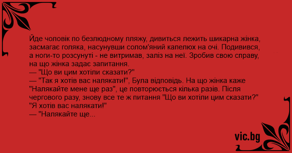 Йде чоловік по безлюдному пляжу, дивиться лежить шикарна жінка, засмагає голяка, насунувши солом'яний капелюх на очі. Подивився, а ноги-то розсунуті - не витримав, заліз на неї. Зробив свою справу, на що жінка задає запитання.
