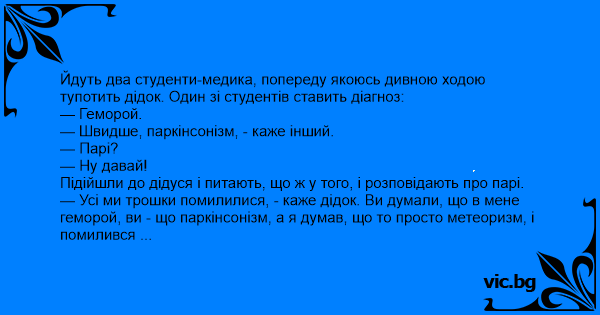 Йдуть два студенти-медика, попереду якоюсь дивною ходою тупотить дідок. Один зі студентів ставить діагноз: